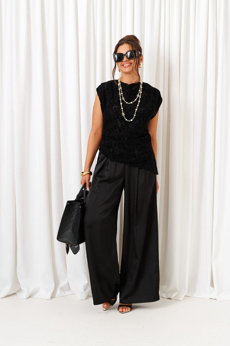 Брючный комплект в комбинации сияющего роскошного атласа с эффектным кружевом не останется незаметным!