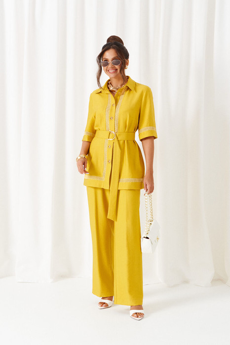 Стильный костюм состоит из блузы и брюк, выполнен из мягкой ткани с волокнами льна и вискозы, практичен в носке.