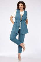 Комплект 2-х предметный состоит из жакета и и брюк. Жакет женский удлиненный,из трикотажной ткани, полуприлегающего силуэта с центральной бортовой застежкой на пуговицы до линии перегиба лацкана. Спереди рельефные швы от плечевого шва, отрезной бочок и карман с клапаном. Спинка с рельефами от плечевого шва. Рукав втачной, двухшовный. Воротник пиджачного типа. Перед жакета на подкладке, длина по спинке 67 см, длина рукава 62 см. Брюки классические,из текстильной ткани, прямые, слегка заужены к низу,заутюжены стрелки,по переду обработаны карманы с отрезным бочком,застежка на тесьму-молнию и 1 пуговицу.На задних половинках обработаны вытачки и имитация карманов с листочкой, пояс в брюках притачной. Длина брюк от талии по боковому шву 100 см.