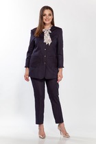 Комплект женский-двойка, из текстильной ткани, жакет удлиненный, полуприлегающего силуэта с центральной бортовой застежкой на пуговицы до линии перегиба лацкана. Спереди рельефные швы от плечевого шва, отрезной бочок и карман с клапаном. Спинка с рельефами от плечевого шва. Рукав втачной, двухшовный. Воротник пиджачного типа. Жакет на подкладке, длина по спинке 67 см, длина рукава 62 см. Брюки прямые,классические, с заутюженными стрелками,по переду обработаны карманы с отрезным бочком,застежка на тесьму-молнию и 1 пуговицу.На задних половинках обработаны вытачки и имитация карманов с листочкой, пояс в брюках притачной. Длина брюк от талии по боковому шву 100 см.