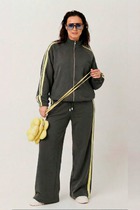 Комплект женский-двойка, из текстильной ткани, жакет женский удлиненный, из трикотажной ткани, перед жакета на подкладке, полуприлегающего силуэта с центральной бортовой застежкой на пуговицы до линии перегиба лацкана. Спереди рельефные швы от плечевого шва, отрезной бочок и карман с клапаном. Спинка с рельефами от плечевого шва. Рукав втачной, двухшовный. Воротник пиджачного типа. Длина по спинке 70, длина рукава 61. Брюки-палаццо,средней ширины,из плотной текстильной ткани, выполнены с карманами с отрезным бочком в боковом шве. Пояс притачной, застёжка на молнию. По задним половинкам обработаны вытачки. Длина по боковому шву 108 см.