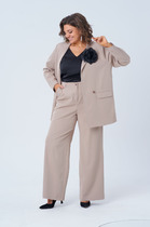 Комплект женский, 2-х предметный, состоит из жакета и и брюк. Жакет женский удлиненный, из текстильной ткани, на подкладке, полуприлегающего силуэта с центральной бортовой застежкой на пуговицы до линии перегиба лацкана. Спереди рельефные швы от плечевого шва, отрезной бочок и карман с клапаном. Спинка с рельефами от плечевого шва. Рукав втачной, двухшовный, по низу рукава обработана шлица на петли-пуговицы. Воротник пиджачного типа. Длина по спинке 66 см, длина рукава 62 см.Брюки прямые,классические, с заутюженными стрелками,по переду обработаны карманы с отрезным бочком,застежка на тесьму-молнию и 1 пуговицу.На задних половинках обработаны вытачки и имитация карманов с листочкой, пояс в брюках притачной. Длина брюк от талии по боковому шву 100 см.