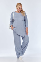 Комплект 2-х предметный из хлопковой ткани, состоит из жакета и и брюк. Жакет женский удлиненный, полуприлегающего силуэта с центральной бортовой застежкой на пуговицы до линии перегиба лацкана. Спереди рельефные швы от плечевого шва, отрезной бочок и карман с клапаном. Спинка с рельефами от плечевого шва. Рукав втачной, двухшовный, 3/4, с небольшим разрезом в локтевом шве. Воротник пиджачного типа. Перед жакета на подкладке. Длина рукава 50, длина по спинке 68 см. Классические брюки, прямые, слегка заужены к низу,заутюжены стрелки,по переду обработаны карманы с отрезным бочком,застежка на тесьму-молнию и 1 пуговицу.На задних половинках обработаны вытачки и имитация карманов в рамку с двумя обтачками,пояс в брюках притачной. По низу брюк в боковом шве есть небольшой разрез. Длина брюк от талии по боковому шву 93 см.