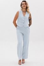 Комплект женский-двойка, из текстильной ткани, жакет удлиненный, полуприлегающего силуэта с центральной бортовой застежкой на пуговицы до линии перегиба лацкана. Спереди рельефные швы от плечевого шва, отрезной бочок и карман с клапаном. Спинка с рельефами от плечевого шва. Рукав втачной, двухшовный. Воротник пиджачного типа. Жакет на подкладке, длина по спинке 67 см, длина рукава 62 см. Брюки прямые, классические, с заутюженными стрелками, по переду обработаны карманы с отрезным бочком, застежка на тесьму-молнию и 1 пуговицу. На задних половинках обработаны вытачки и имитация карманов с листочкой, пояс в брюках притачной, по боковому на резинке.  Длина брюк от талии по боковому шву 103 см.