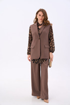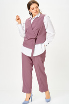 Комплект женский-двойка, из текстильной ткани, жакет удлиненный, полуприлегающего силуэта с центральной бортовой застежкой на пуговицы до линии перегиба лацкана. Спереди рельефные швы от плечевого шва, отрезной бочок и карман с клапаном. Спинка с рельефами от плечевого шва. Рукав втачной, двухшовный. Воротник пиджачного типа. Жакет на подкладке, длина по спинке 66 см, длина рукава 62 см. Брюки прямые, классические, с заутюженными стрелками, по переду обработаны карманы с отрезным бочком, застежка на тесьму-молнию и 1 пуговицу. На задних половинках обработаны вытачки и имитация карманов с листочкой, пояс в брюках притачной. Длина брюк от талии по боковому шву 103 см.