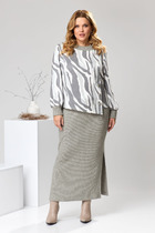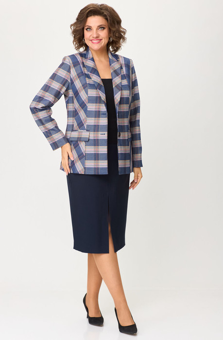 Комплект женский-двойка, из текстильной ткани, жакет удлиненный, полуприлегающего силуэта с центральной бортовой застежкой на пуговицы до линии перегиба лацкана. Спереди рельефные швы от плечевого шва, отрезной бочок и карман с клапаном. Спинка с рельефами от плечевого шва. Рукав втачной, двухшовный. Воротник пиджачного типа. Жакет на подкладке, длина по спинке 67 см, длина рукава 62 см.Юбка прямого силуэта, с небольшой кокеткой в верхней части, которая обработана обтачкой, спереди обработан разрез-шлица. Заднее полотнище со средним швом и талиевыми вытачками, застегивается на потайную молнию. Длина по боковому шву 74 см. Юбка на подкладке.