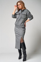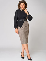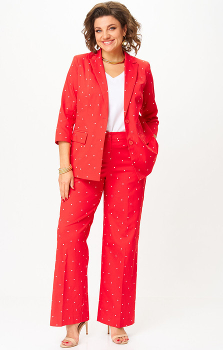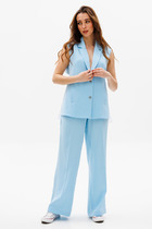 Комплект 2-х предметный из хлопковой ткани, состоит из жакета и и брюк. Жакет женский удлиненный, полуприлегающего силуэта с центральной бортовой застежкой на пуговицы до линии перегиба лацкана. Спереди рельефные швы от плечевого шва, отрезной бочок и карман с клапаном. Спинка с рельефами от плечевого шва. Рукав втачной, двухшовный, 3/4, с небольшим разрезом в локтевом шве. Воротник пиджачного типа. Перед жакета на подкладке. Длина рукава 50, длина по спинке 68 см. Брюки-палаццо, средней ширины, выполнены с карманами с отрезным бочком в боковом шве. Пояс притачной, по боковым швам резинка, застёжка на молнию. По задним половинкам обработаны вытачки. Длина по боковому шву 108 см.