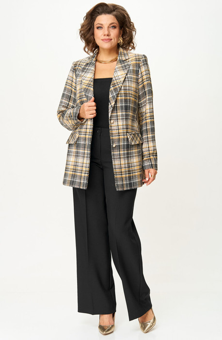 Комплект женский-двойка,из костюмной ткани, жакет удлиненный, свободного силуэта с центральной бортовой застежкой на пуговицы до линии перегиба лацкана. По переду имеется отрезной бочок и вертикальные вытачки. С прорезными карманами с клапаном и двумя обтачками. Спинка цельная. Воротник пиджачного типа. Рукав двухшовный, втачной. Жакет на подкладке. Длина рукава 63 см, длина по спинке 75 см. Брюки-палаццо,средней ширины, выполнены с карманами с отрезным бочком в боковом шве. Пояс притачной, застёжка на молнию. По задним половинкам обработаны вытачки. Длина по боковому шву 108 см.