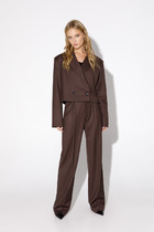 Комплект женский, 2-х предметный, состоит из жакета и и брюк. Жакет женский удлиненный, из текстильной ткани, на подкладке, полуприлегающего силуэта с центральной бортовой застежкой на пуговицы до линии перегиба лацкана. Спереди рельефные швы от плечевого шва, отрезной бочок и карман с клапаном. Спинка с рельефами от плечевого шва. Рукав втачной, двухшовный, по низу рукава обработана шлица на петли-пуговицы. Воротник пиджачного типа. Длина по спинке 66 см, длина рукава 62 см.Брюки прямые,классические, с заутюженными стрелками,по переду обработаны карманы с отрезным бочком,застежка на тесьму-молнию и 1 пуговицу.На задних половинках обработаны вытачки и имитация карманов с листочкой, пояс в брюках притачной. Длина брюк от талии по боковому шву 105 см.
