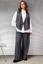 Комплект женский, 2-х предметный, состоит из жакета и и брюк. Жакет женский удлиненный, из текстильной ткани, на подкладке, полуприлегающего силуэта с центральной бортовой застежкой на пуговицы до линии перегиба лацкана. Спереди рельефные швы от плечевого шва, отрезной бочок и карман с клапаном. Спинка с рельефами от плечевого шва. Рукав втачной, двухшовный, по низу рукава обработана шлица на петли-пуговицы. Воротник пиджачного типа. Длина по спинке 66 см, длина рукава 62 см.Брюки прямые,классические, с заутюженными стрелками,по переду обработаны карманы с отрезным бочком,застежка на тесьму-молнию и 1 пуговицу.На задних половинках обработаны вытачки и имитация карманов с листочкой, пояс в брюках притачной. Длина брюк от талии по боковому шву 103 см.