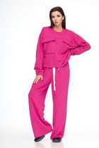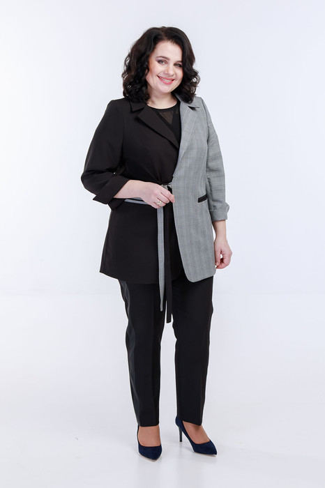 Комплект женский полуприлегающего силуэта двухцветный, прилегание достигается за счет рельфов, идущих из проймы. Жакет выполнен из сочетания двух тканей: гладкой костюмной и клетки плотной костюмной ткани. Воротник двухцветный втачной с отложным лацканом, рукав двухшовный с разрезом, на полочке обработаны функциональные карманы на контрасте с основным цветом. Застегивается на завязки. Брюки полуприлегающего силуэта, на поясе без резинки застегивается на молнию и пуговицу спереди, в боковых швах лампасы из эко-кожи.