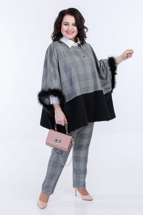 Комплект женский двухпредметный: кардиган и брюки. Кардиган женский свободного силуэта выполнен в стиле Пончо из двух цветов и фактур тканей: плотная костюмная клетка, по низу отделка из черной трикотажной буклированной ткани, на подкладке. Горловина круглая, изделие застегивается на две декоративные пуговицы сверху. Край рукава украшен натуральным боа. Брюки женские классические полуприлегающего силуэта выполнены из костюмной клетки с добавлением спандекса, с высокой посадкой. Пояс без резинки, с застежкой молнией на пуговицу. В боковых швах карманы с листочкой.
