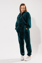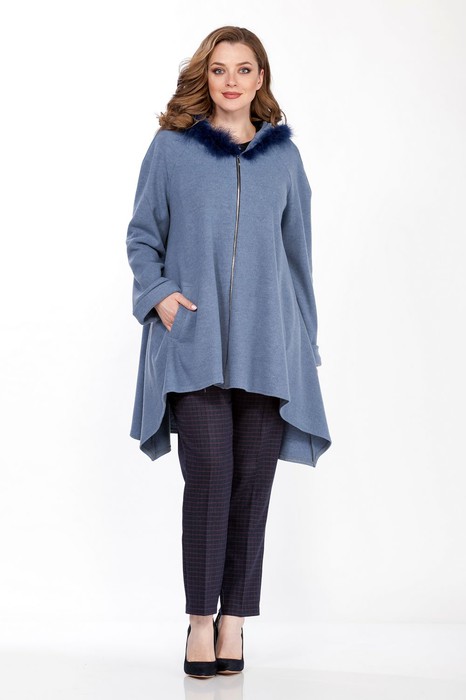 Комплект женский двухпредметный состоит из кардигана и брюк. Кардиган А- силуэта выполнен из плотной вязаной ткани под ангору, с капюшоном, отделанным натуральным боа, на молнии, на полочках обработаны функциональные карманы с листочкой, рукав реглан с отложными манжетами. Низ кардигана асимметричный, длина по спинке- 89 см, длина рукава от горловины 74 см. Брюки классические  с высокой посадкой, полуприлегающего силуэта, выполнены из плотной костюмной ткани в клетку с добавлением эластана.  Пояс без резинки, с застежкой молнией на пуговицу. В боковых швах карманы с листочкой. Длина брюк 103 см.