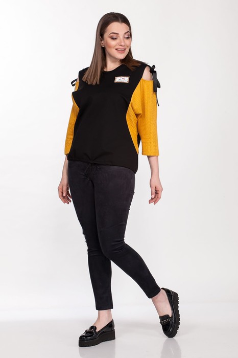 Комплект женский двухпредметный состоит из джемпера и брюк (леггинсов). Джемпер  кроя летучая мышь, выполнен из сочетания двух трикотажных тканей разных фактур и цветов, в  плечевом срезе обработан разрез с завязками, рукав 3/4, по низу кулиска собирается на шнурок.  Длина джемпера по спинке 68 см. Брюки (леггинсы)  прилегающего силуэта,выполнены из эко-замши с добавлением эластана с декоративными подрезами, спинка  украшена нефункциональной листочкой, пояс на резинке. Длина изделия- 103 см