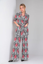 Комплект женский трехпредметный свободного силуэта, состоит из кардигана, блузона  и брюк. Кардиган без застежки, рукав втачной 3/4 с притачным довязом. Блузон двухслойный без рукава на штроких брителях. Брюки классичкские с высокой посадкой полуприлегающего силуэта, выполнены из плотной костюмной ткани с добавлением эластана. Пояс без резинки с застежкой молнией на пуговицу. В боковых швах карманы с листочкой. Длина брюк 103 см.