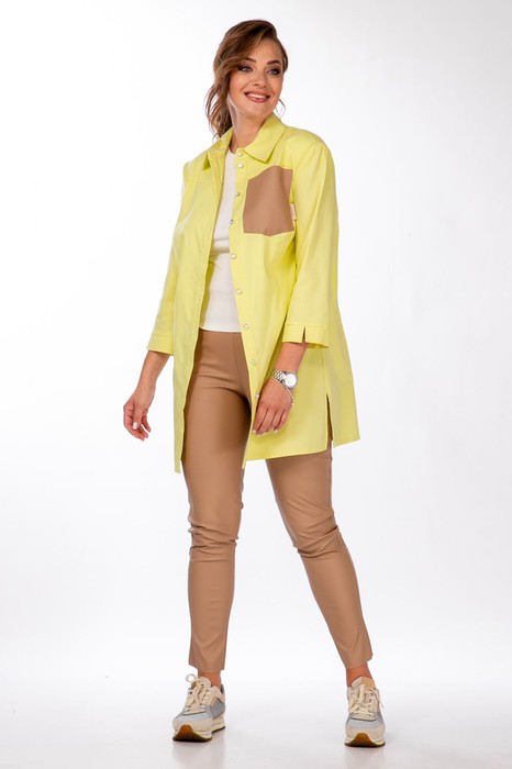Костюм женский двухпредметный, состоит: рубашка +легинсы. Рубашка полуприлегающего силуэта, воротник рубашечный на стойке, застежка центрально-бортвая на петли и пуговицы, рукав втачной 3/4 с манжетом, в боковых швах разрезы, полочка украшена накладным карманом из экокожи. Легинсы прилегающего силуэтас высокой посадкой, пояс на резинке.