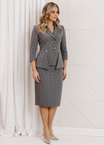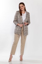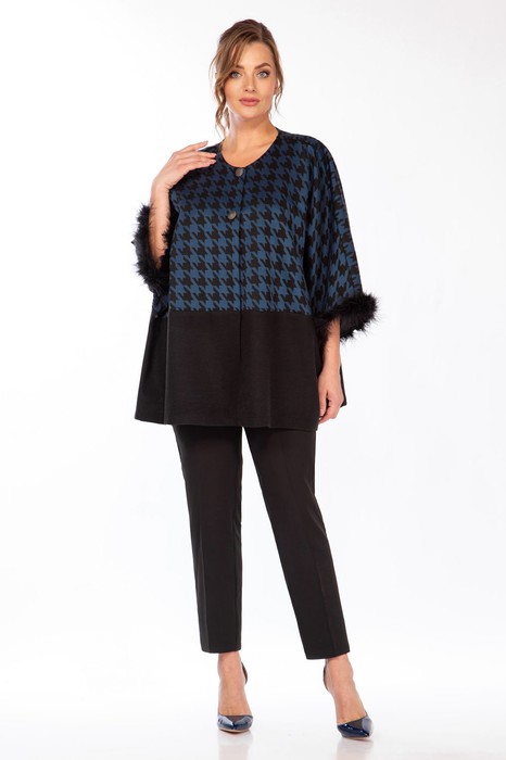 Костюм женский двухпредметный, состоит из кардигана и брюк. Кардиган свободного силуэта, двухцветный, выполнен из трикотажной ткани на подкладке. Рукав украшен Боа, застежка центрально-бортовая на две петли и пуговицы. Брюки классические с высокой посадкой, полуприлегающего силуэта, выполнены из костюмной ткани с добавлением эластана. Пояс без резинки с застежкой молнией на пуговицу. В боковых швах карманы с листочкой. Длина брюк 103 см.