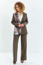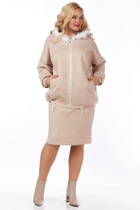 Костюм женский трикотажный, двухпредметный. Состоит из кардигана и юбки. Кардиган на подкладке с функциональными карманами по переду, застежка молния, по низу изделия кулиска со шнурком, капюшон украшен боа. Юбка полуприлегающего силуэта на трикотажной подкладке, пояс на резинке, в боковом шве разрез.