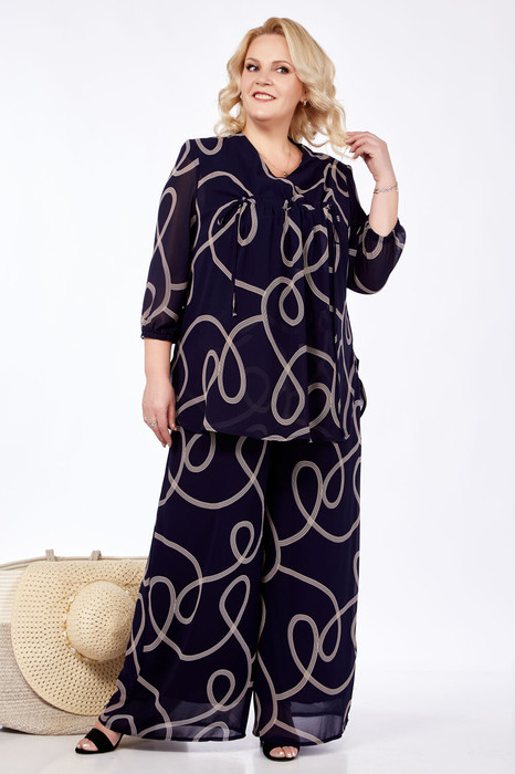 Костюм женский двухпредметный,свободного силуэта, состоит из блузки и брюк. Ткань шифон. Блузка с запахом и сборкой по переду выше уровня груди и с закругленными краями, рукав втачной 3/4 , низ рукава на резинке. Брюки с карманами в боковых швах и на трикотажной подкладке, пояс на резинке.