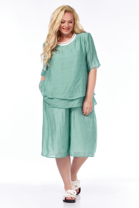 Костюм женский двух предметный, свободного силуэта. Блузка двухслойная, рукав втачной. Шорты на подкладке, пояс на резинке, в боковых швах карманы.