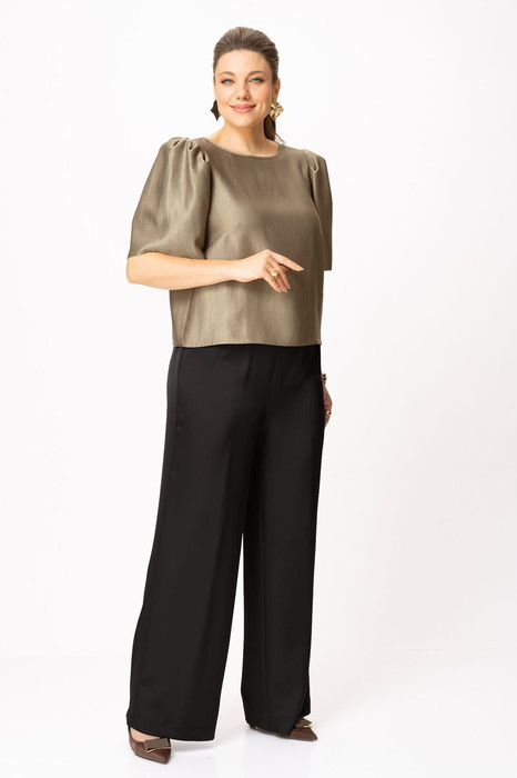 Блузка свободного силуэта из плательной ткани с блеском. Горловина круглая, по спинке в центральном шве разрез возле горловины с завязками.