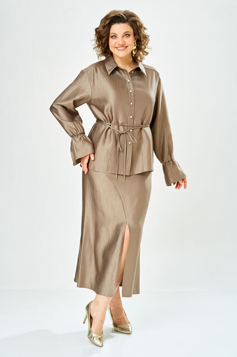 Юбка расширенная к низу, по переду фигурный рельеф с разрезом по низу, застежка в среднем шве спинки на тесьму молния. Юбка на подкладке.