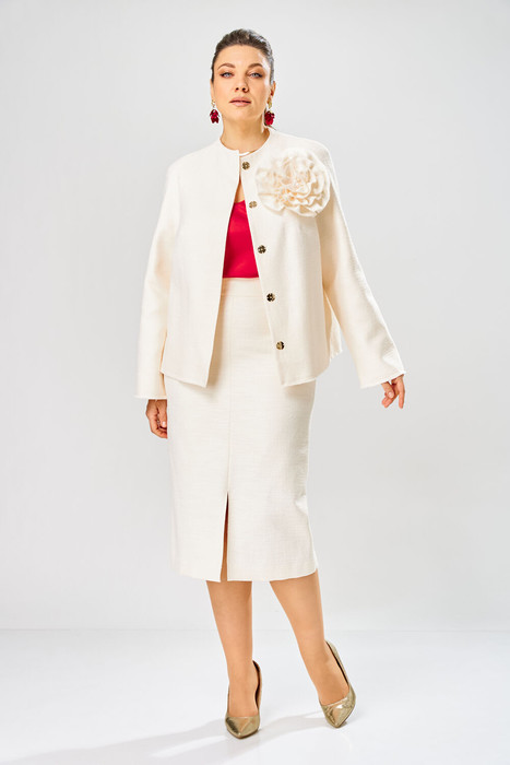 Юбка карандаш, актуальной длины до середины икры. По переду и спинке центральные швы, в переднем шве по низу разрез, по спинке застежка молния, верх юбки оформлен отрезным поясом. Юбка на подкладке.