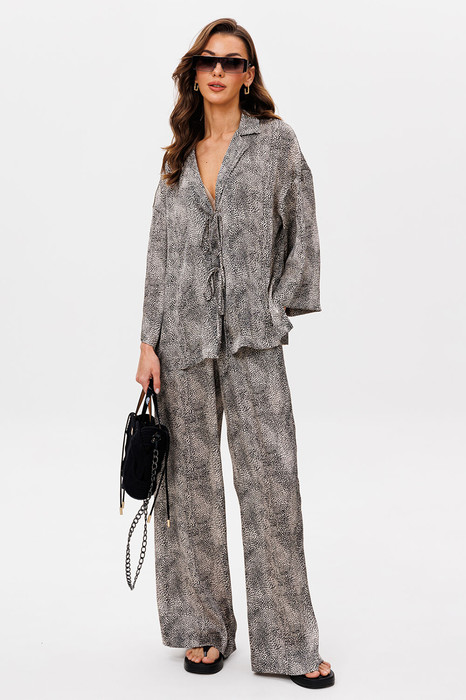 Костюм 2-х предметный состоит из блузки и брюк. Блузка прямого силуэта с втачным расклешенным к низу рукавом длинной 3/4. Полочка с центральной застежкой на завязки. Внизу по боковым швам обработаны разрезы. Воротник пиджачного типа. Брюки прямого силуэта на притачном, отстроченном поясе на резинке. С карманами в боковых швах.
