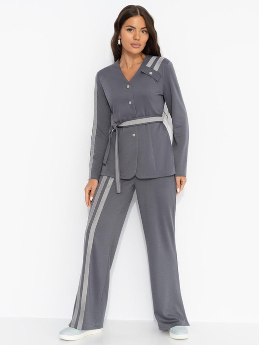 Костюм ЧАРУТТИ – код элегантного превосходства. Не просто серый, а изумительный серый – как любимый город после первого глотка кофе! Займите свое (главное!) место в алгоритмах мегаполиса. Комплект состоит из брюк прямого кроя с контрастными лампасами и жакета. Жакет застегивается на клепки. Есть разрезы по бокам изделия. Брюки с карманами. Пояс на скрытой широкой резинке. Пояс в комплекте.