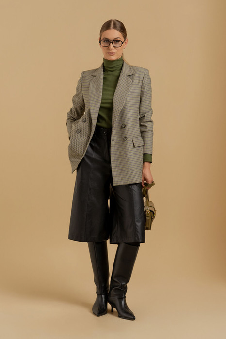 Комплект женский трехпредметный. Жакет классического покроя из поливискозной ткани. Вырез горловины оформлен воротником пиджачного типа с двубортной застежкой на петли с пуговицами. Рукава - втачные, двухшовные. Линия плеч усилена плечевыми накладками. Спереди имеются прорезные карманы, сзади - шлица. Изделие посажено на подкладку. Шорты-бермуды из искусственной кожи на хлопковой основе. Пояс - отрезной с эластичной тесьмой и застежкой на брючный крючок. В боковых швах - карманы с отрезными бочками. Изделие декорировано вертикальными подрезами с отделочными строчками. Есть шлевки для ремня. Джемпер женский полуприлегающего силуэта из трикотажного полотна. Вырез горловины - неглубокий, округлой формы. Рукава - втачные.