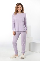Костюм молодежный из гладкокрашенного полотна «флис», состоящий из джемпера и брюк. Джемпер – прямого силуэта, с длинными втачными рукавами, горловиной овальной формы, обработанной втачной планкой. На левом рукаве выполнена вышивка, низ обработан манжетами. По низу изделия подгибка с вложением эластичной тесьмы, регулируемой по длине фиксаторами.Брюки – длинные, свободные, на притачном поясе с эластичной тесьмой внутри, карманами в боковых швах. Нижние срезы обработаны подгибкой с вложением эластичной тесьмы, регулируемой фиксаторами.
