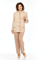 Комплект брючный состоит из брюк, майки и блузона. Брюки и майка выполнены из тонкого трикотажного полотна. Брюки широкие, с резинкой по талии. Майка с глубоким "о"-образным вырезом горловины и нагрудными вытачками. Блузон выполнен из прозрачного шифона и гипюра. Перед и спинка имеют ассиметричные подрезы: по правой стороне рельеф от которого в область талии подрез и кулиса. Блузон драппируется за счет пояса, который проходит через кулису.