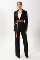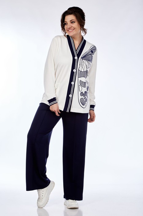 Комплект брючный из трикотажного полотна. Кардиган с центральной застежкой на 4 петли и пуговицы. Перед с накладным карманом на правой полочке и печатью в виде крыла бабочки на левой полочке. Рукав втачной одношовный с манжетом из довяза в полоску. По борту и горловине довяз в полоску. Брюки прямого силуэта с поясом на резинке. По передним половинам брюк отстрочена стрелка.