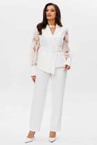 Костюм женский с юбкой из трикотажа. Кофта с цельнокроенными рукавами и отрезными бочками. Перед со средним швом и защипом на 0,2 см вдоль него. Спинка со средним швом. Горловина V-образной формы. В качестве отделки нашивка в правом нижнем углу переда. Юбка длинная, расклешеная к низу. Заднее полотнище со средним швом. Пояс выполнен из декоративной эластичной тесьмы. Внешний вид фурнитуры может отличаться от заявленной на фото.