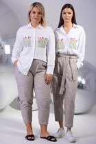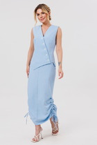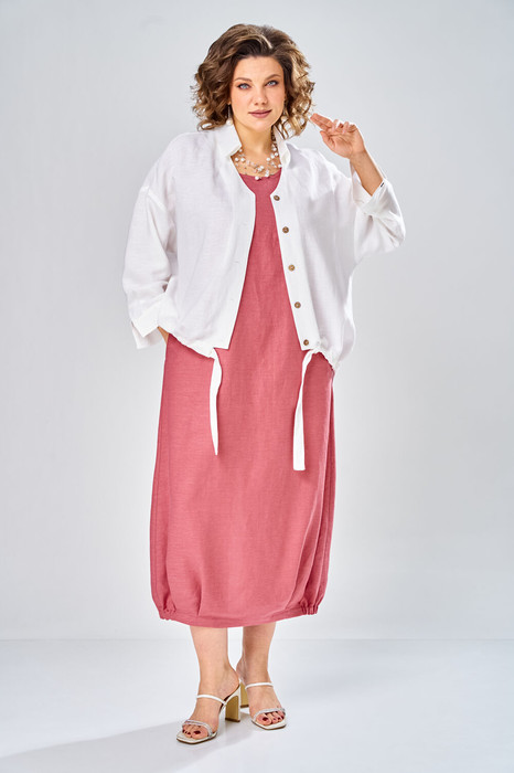 Комплект женский состоит из рубашки и платья. Платье длинное, свободного кроя. Спинка со среднем швом, разрезом, талиевыми вытачками, 2-мя складками по низу. Перед с нагрудными вытачками и складками по низу. Карманы обработаны в боковых швах. Низ платья по бокам собран на резинку. Рубашка совбодного кроя с центральной застежкой на 5 петель и пуговиц. Спинка с округлым подрезом и отделкой в ивде надписи. Перед по низу фиксируется кулисой и завязками. Воротник на стойке с обработанной горловиной . Рукав втачной, одношовный со спущенной линией плеча. По низу рукава манжет с застежкой.