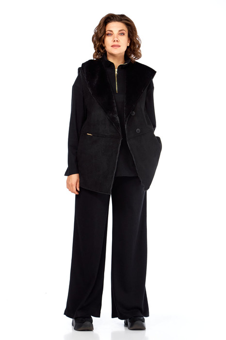 Комплект брючный состоит из кофты, жилетки и брюк. Кофта полуприлегающего силуэта со спущенным плечом, рукав втачной, одношовный. Воротник стойка с застежкой на тесьму-молнию. По боковым швам разрезы. Брюки расширенные книзу, верхний срез обработан поясом с резинкой. В боковых швах карманы. Жилетка свободного кроя со смещенной застежкой на петлю и пуговицу. По спинке горизонтальный рельефный шов на перед, в котором обработаны карманы. Цельнокроенный капюшон с центральной частью. В качестве отделки используется фурнитура.