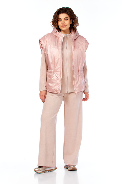 Комплект женский состоит из жилетки, брюк и кофты. Брюки прямые, широкие с лампасами и боковыми карманами. Кофта с центральной застежкой на молнию. Кокетками и лампасами по рукавам. Жилетка с центральной застежкой на молнию. По бокам перед и спинка соединены поясом со шнуром, который проходит в кулисе на спинке и частично на полочке. Низ округлой формы. Воротник капюшон с кулисой и шнуром. Фурнитура может отличаться от заявленной на фото. Жилет из плащевой ткани.