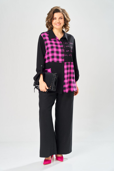 Комплект брючный состоит из блузы-рубашки и брюк.. Рубашка выполнена из 2-ух видов х/б ткани: черной и в клетку. Спинка с плечевой кокеткой и имитацией  застежки в нижней части из отделочной ткани. Перед с подрезом в области талии и 1 накладным карманом в нижней части правой полочки. Застежка на 7 петель и пуговиц. Рукав втачной, одношовный с хлястиком для регулировки длины. Воротник на стойке. Брюки прямые широкие с карманами в боковых швах и поясом на резинке.