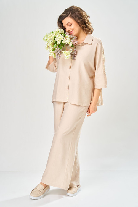 Комплект брючный состоит из рубашки и брюк. Рубашка со спущенным плечом, с застежкой на петли и пуговицы. По спинке кокетка, по шву притачивания нижней части заложена складка, по боковым швам-разрезы. Рукав втачной одношовный короткий. Воротник стояче-отложной с отрезной стойкой. Используются две ткани. Брюки прямые, пояс на резинке.