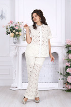 Комплект брючный состоит из жакета и брюк. Жакет полуприлегающего силуэта с центральной застежкой на петли и пуговицы. По переду кокетка, рельефные швы до низа, отрезной пояс по низу. Рукав втачной , одношовный полной длины с манжетом. Воротник стояче-отложной. Брюки зауженные к низу, застрочены вытачки, на передних половинках на уровне колена застрочены вытачки, в боковых швах обработаны карманы с листочкой, на задней половинке накладные карманы.Пояс с резинкой и шнурком.