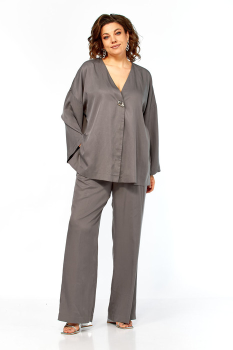 Комплект брючный свободного кроя состоит из кардигана и брюк. Брюки свободного кроя прямые с карманами в боковых швах и поясом на резинке. Кардиган с центральной застежкой на 2 потайные кнопки. Перед с V-образной горловиной, украшен брошью. Рукав втачной одношовный со спущенной линией плеча. По боковым  швам разрезы. По бортам широкая отделочная полочка. Фурнитура может отличаться от заявленной на фото.