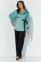 Брюки - зауженные к низу, с застежкой с гульфиком и откоском в среднем шве брюк, с притачным поясом со шлевками. По задней части пояса – резинка. Передние половинки брюк со стрелками, складками, боковыми карманами. Задние половинки брюк со стрелками и двумя парами талиевых вытачек.