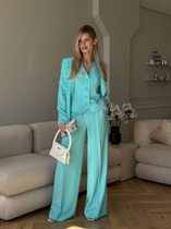 Костюм женский из однотонной ткани платьево-блузочного ассортимента. Блузка прямого силуэта сзастежкой на пробивные кнопки, и сформированными завязками по низу. Вортник с притачной стойкой. Рукав втачной с цельнокроенными отложными манжетами. Юбка широкая прямая с притачным поясом с эластичной тесьмой внутри. По верхнему срезу юбки заложены складки. В боковых швах обработаны карманы.