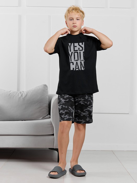 Костюм для мальчика, состоящий из футболки и шорт. Футболка однотонная с принтом на груди; модель свободная, со спущенной линией плеч. Шорты из полотна с набивным рисунком эксклюзивного дизайна, с боковыми карманами с обтачными входами, на притачном поясе с отстроченной эластичной тесьмой.