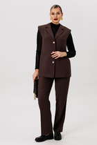 Пиджак костюма имеет отложной воротник, застежку на одну пуговицу и пояс, что обеспечивает комфорт и изысканный вид. Рукава три четверти добавляют образу оригинальности и практичности. Брюки имеют прямой крой, что делает их удобными и подходящими для различных типов фигуры.