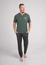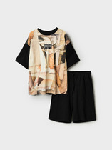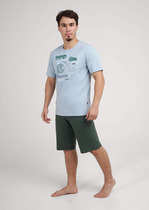 Костюм мужской футболка и шорты. Футболка из кулирного полотна, свободная, прямого силуэта, с принтом. Втачной короткий рукав. Горловина круглая, обработана узким воротником. Плечо и горловина спинки усилены тесьмой. Шорты из футера с лайкрой - свободные, с притачным поясом и карманами. Низ - подгибка.