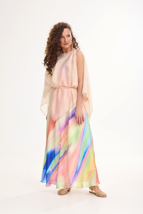 Комплект женский, состоящий из платья и палантина. Платье А-силуэта, на хлопковой подкладке. Вырез горловины V-образный, по переду и спинке. В плечевом шве кулисы со шнуром. Палантин дизайнерского кроя, с застёжкой на навесную петлю и пуговицу по горловине. По задумке художника, мы имеем возможность носить палантин в различных вариантах: придав асимметрию, оголяя плечо; перевернуть, прикрыв руки, и за счет ремня сделать низ разноуровневым; можно одевать без пояса, придав образу "воздушность". В комплекте декоративный пояс.