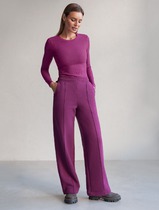 Костюм женский, состоящий из туники и брюк. Туника прямого силуэта, по спинке воротник притачная стойка, а по переду цельнокроеная стойка, линия плеча спущена, рукав втачной, заканчивающийся манжетой с открытым срезом из отделочной ткани. По разрезу и низу туники притачная планка с открытым срезом из отделочной ткани. По переду настрачной декоративный элемент. Брюки прямого силуэта типа "палаццо", по передней части боковые карманы, пояс притачной с резинкой по кругу.
