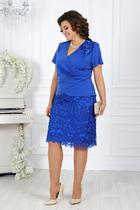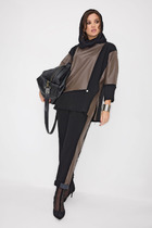 Комплект женский, состоящий из комбинезона и шазюбля. Комбинезон прямого силуэта. Вырез горловины по переду и спинке V-образный. Застежка в среднем шве спинки на потайную молнию. В боковых швах карманы. Шазюбль прямого силуэта. Состоит из трех видов ткани. Застежка на петли и пуговицы на планке. Воротник рубашечного типа. Рукав втачной, заканчивается манжетой с завязками. По спинке кокетка. Нижняя часть спинки выполнена из сетки. В боковых швах высокие разрезы и хлястики, которые помогают регулировать прилегание.