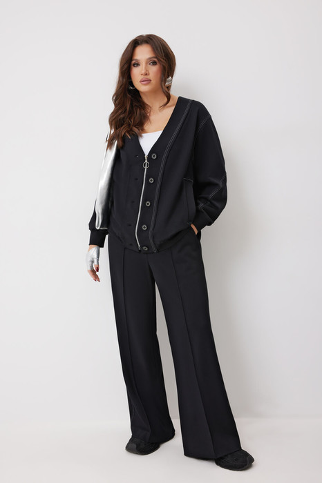 Комплект женский, состоящий из кардигана и брюк. Кардиган прямого силуэта, со спущенной линией плеча. Рукав длинный, заканчивающийся притачной манжетой. Спинка с горизонтальной кокеткой. Вырез горловины V-образный. По краю борта, горловине, спинке и низу кардигана притачные планки. Кардиган застегивается на притачную молнию либо на петли-пуговицы.  Брюки прямого силуэта, по переду карманы и имитация застёжки. Пояс притачной с резинкой. Комплект декорирован отделочными строчками, нитками контрастного цвета и частично открытыми срезами.